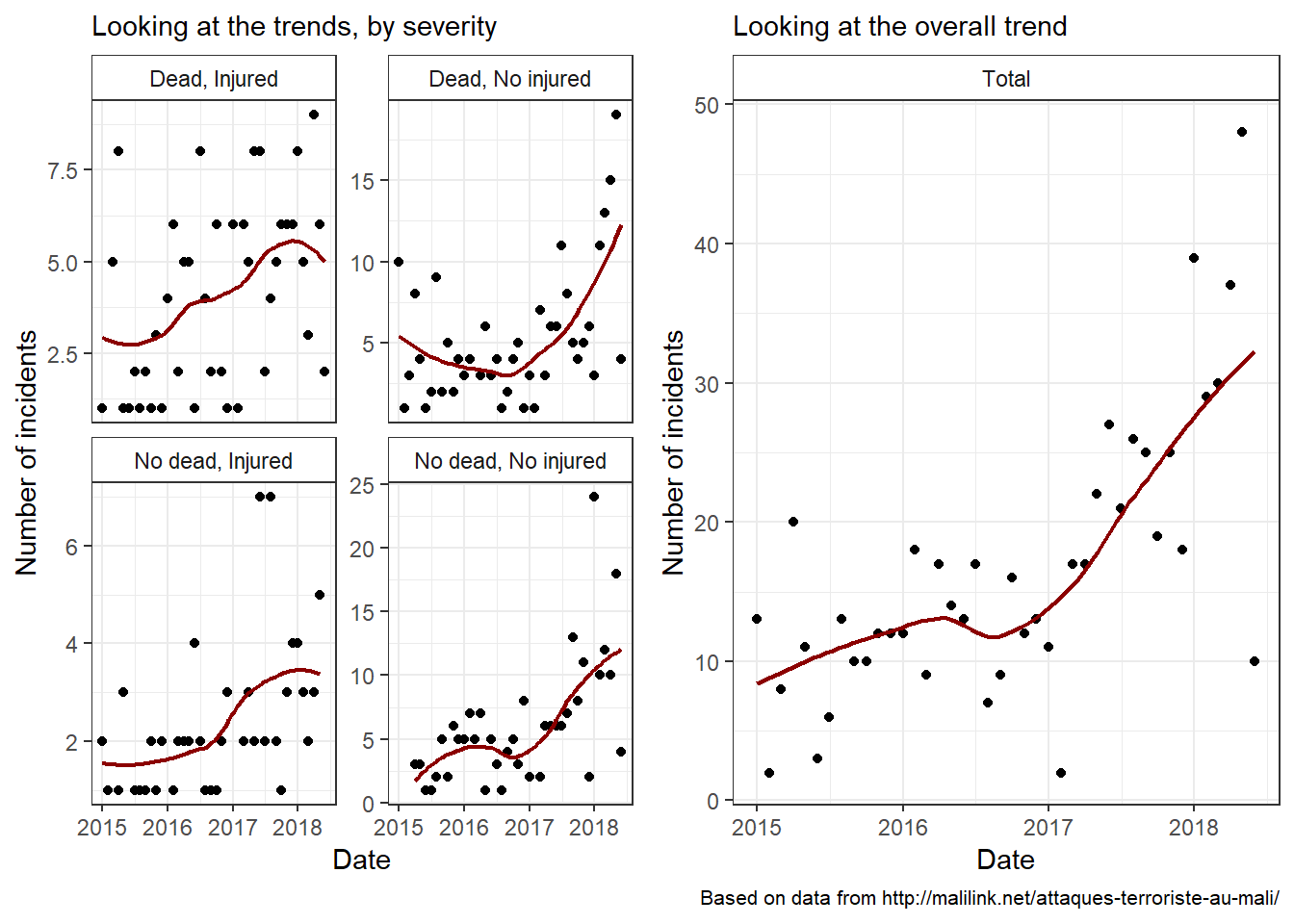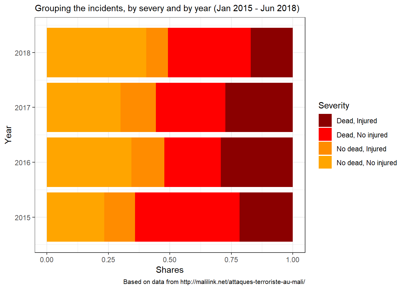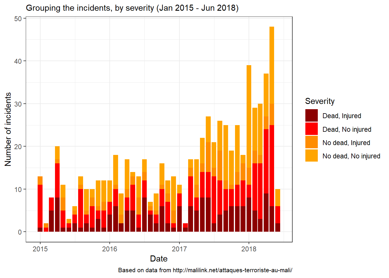 In this post, I keep exploring the data on security incidents in Mali from this Malilink webpage. Here I introduce the notion of severity because I felt that is useful to remind ourselves that the incidents are not all equal. Some, while unfortunate, leave their victims with more unpleasant memories than irreperable scars (mass robbery for instance). Other, however, are devastating by their deadly nature (explosions, mass shootings, etc.). To take that into account, I thought it could be interesting to create a categorical variable that would serve as a facetting parameter. Hence this notion of severity. We’ll give it four values: