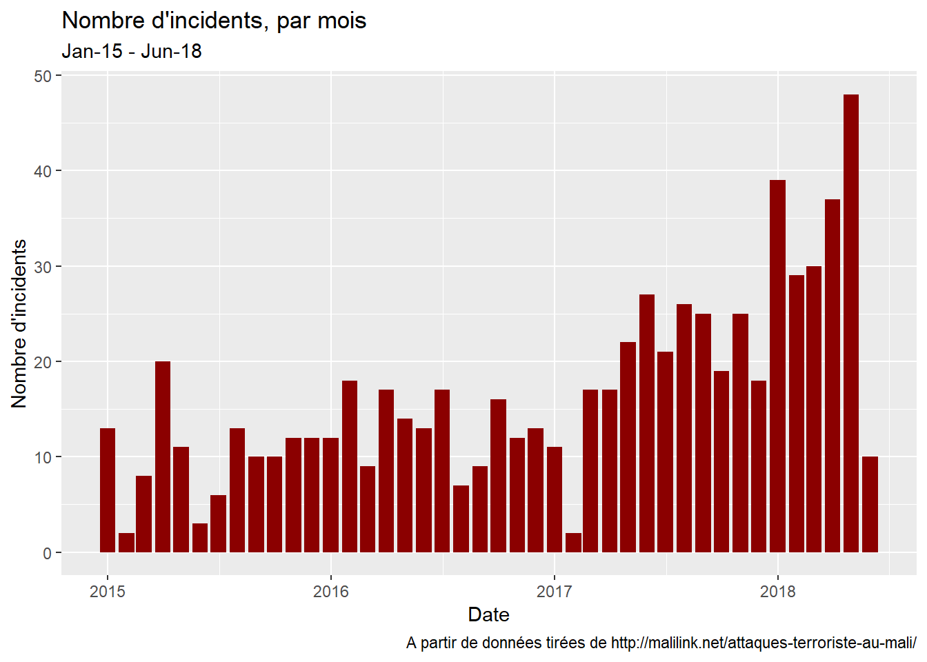 Selon la transformation choisie, la liste de départ peut soit être organisée en données de panel ou en série temporelle. Pour faire simple, je me suis tourné vers le second choix - optant pour une agrégation mensuelle - et, pour l’accompagner, des barres (barplot).